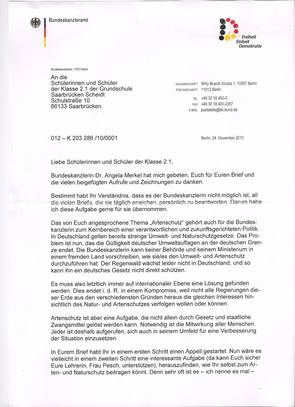 Das Bundeskanzleramt hat der Klasse 2.1 auf ihre Protestbriefe geantwortet. Die Schüler der zweiten Klasse haben am 11. November 2010 an Frau Merkel appeliert sich auf der Klima-Konferenz in Cancun für den Schutz des Regenwaldes einzusetzen.