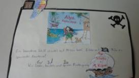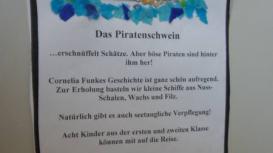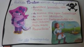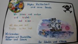 Wir haben ein Piratenkopftuch gemacht und wir haben das Buch die kleinen Piraten und das Abenteuer vorgelesen bekommen. Und es gab ein Buffet. Wir durften ganz viele Bilder malen und laminieren. Dann gab es unten in der Aula eine kurze Besprechung. Dort haben Kinder erzählt, wie es war. Es war sehr schön.