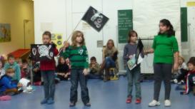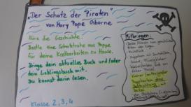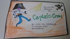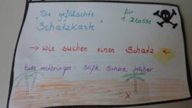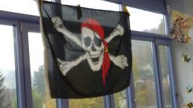 Wir haben zuerst Fragen (über Piraten) gestellt, die wir nicht wussten. Frau Münster-Biehl hat sie uns beantwortet (aus dem Buch „Frag doch mal die Maus – Piraten“) und danach haben wir gefrühstückt. Und dann haben wir eine Schatzkarte gekriegt und mussten das Rätsel auf der Schatzkarte lösen. Und in der Schatztruhe (die unsere Lehrerin mitgebracht hatte) waren Gummibären. Und dann war Pause. Und nach der Pause haben wir eine Piratenflagge gebastelt aus Stoff und weißer Farbe. Und danach haben wir noch mal gefrühstückt. Und dann haben wir einen Erzählkreis gemacht und wir durften erzählen, wie es uns gefallen hat. Und dann sind wir in die Aula gegangen und haben unsere Sachen vorgestellt, die wir gebastelt haben, wie die Piratenflagge. Mir hat es sehr gut gefallen.