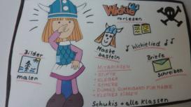 Ich war in der Gruppe „Wicki“ bei Frau Deckert. Dort haben wir ein Kissen geholt und Frau Deckert hat uns Wickie vorgelesen. Danach haben wir gefrühstückt. Dann sind wir in die Hofpause gegangen. Nach der Hofpause haben wir Wikingermasken gebastelt. Als wir fertig waren haben wir Wikingermusik gehört. Und dann hat die Frau Deckert uns wieder was vorgelesen. Danach haben wir Schiffe versenken gespielt. Danach sind alle runter zur Aula gegangen.