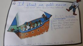 Ich war bei der Mme. Miclo. Sie hatte die Gruppe "Il etait un petit naviere". Dort waren auch Catharina, Sophie, Fynn, Elias. Als erstes haben wir eine Geschichte von einem kleinen Schiffsjungen gehört. Es handelte sich auch um ein Schiff worauf ein Kapitän, ein Kochjunge und ein Ausbilder sind, die nichts mehr zum Essen auf dem Schiff haben. Anschließend haben wir das Lied gehört, es ist das französische Volkslied. Das Lied ist der gleiche Text wie das Buch, aber leider gibt es auch andere Versionen. Nach der Pause haben wir angefangen zu basteln, aber es war nicht irgendeine Bastelei, es heißt Origami. Sie musste uns zeigen, wie man sie macht. Wir bastelten Schiffchen, Kapitän und den Ausbilder. Erst einmal musste man sich Farben aussuchen um anzufangen. Jedes brauchte eine halbe Stunde bis es fertig war. Danach bereiteten wir uns vor für unseren Vortrag. Wir sagten ihnen in der Aula, was wir in der Gruppe gemacht haben und zeigten, wie die Dinge aussahen. Anschließend ließen wir das Lied laufen. Am Ende gingen alle zu ihrer Gruppe, um aufzuräumen. Das war der schönste Projekttag meines Lebens.