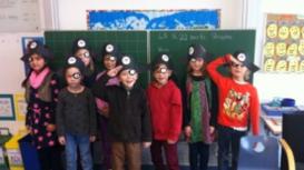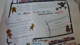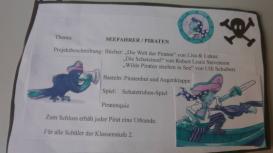 Ich war in der Gruppe Seefahrer/ Piraten bei Frau Baltes und Frau Schack. Ich war in meiner Klasse. Wir haben ein Buch gelesen über Piraten. Wir haben auch ein Quiz gemacht, auch ein paar Fragen beantwortet und haben einen Piratenhut gemacht und eine Augenklappe gebastelt. Und wir haben auch ein Gruppenfoto gemacht. Und wir haben auch aus einer Kiste was rausgesucht, was Piraten brauchen. Und am Schluss haben wir eine Urkunde bekommen. Und dann haben wir über den Tag geredet. Es hat mir gut gefallen. Wir haben uns alle in der Aula getroffen und haben unsere Projekte vorgestellt.