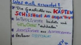 Am Anfang kriegten wir die Geschichte von Kapitän Schisshose (Rudi) vorgelesen. Während Kirsten, Maias Mama, vorlas, durften wir malen. Ich malte zuerst ein Schiff, doch das war nicht gut. Der Paul sagte, dass ich gut malen könnte. Da malte ich für ihn den Käpt’n Schisshose ab. Als ich fertig war, sah er genau aus wie im Buch. Nach der Pause gab es Obstsalat. Es war der erste Obstsalat, der mir so richtig schmeckte. Danach verband man uns die Augen und wir rochen Gewürze. Das waren: Muskatnüsse, Gewürznelken, Vanille, Anis und Zimt. Die Nelken rochen total stark. Dann lasen wir noch ein bisschen. Nun machten wir Armbänder und Windlichter. Für die Armbänder holten wir ein Stück schwarze Schnur. Jeder bekam einen kleinen Ankeranhänger. Alle suchten sich dann verschiedene Perlen und jeder gestaltete sein Armband wie er wollte. Für die Windlichter gab uns Kirsten zuerst ein kleines weißes Tütchen. Dann suchten wir uns eine Serviette aus. Wir schnitten die Verzierungen aus und klebten sie mit einem speziellen Kleber für Servietten auf das Tütchen. Dann räumten wir langsam auf, denn wir mussten gleich in die Aula, um unser Projekt vorzutragen. Als alle saßen, trug die erste Gruppe vor. Aber es gab ein Problem: Sie sprachen total leise! Naja, Hauptsache es hat Spaß gemacht.