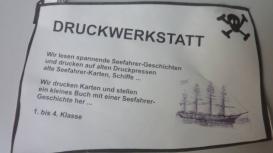 Ich war mit Zara zusammen in der Gruppe Druckwerkstatt. Zuerst haben wir eine Geschichte von Leon Pirat vorgelesen bekommen. Danach haben wir erklärt bekommen, was man nicht bei der Druckerpresse machen darf. Dann haben wir auf Styropor mit Edding und Bleistift ein Motiv auf die Styroporplatten gemalt. Wenn man fertig war, ist man zur Druckerpresse gegangen. Es wurden Farben aufs Styropor gemacht und obendrüber das passende Kalenderblatt gelegt. Wir haben nämlich einen Kalender gemacht. Dann hat man mit beiden Händen an den Griff gefasst und ihn hin und her gezogen. Und dann hat man das Blatt abgezogen und das Bild war fertig. Ich fand es super und habe viel gelernt.